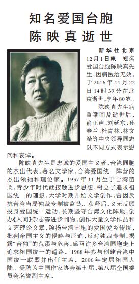人民網北京12月2日電 12月2日出版的《人民日報》在第四版配圖轉發新華社文章——《知名愛國台胞陳映真逝世》。知名愛國台胞陳映真先生,因病醫治無效,於2016年11月22日14時39分在北京逝世,享年80歲。