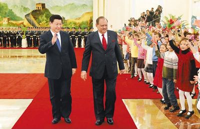 会谈前,习近平在人民大会堂北大厅为侯赛因举行欢迎仪式。全国人大常委会副委员长沈跃跃、国务委员杨洁篪、全国政协副主席王正伟等出席。