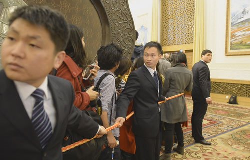 会议结束前,警卫人员用20米长的绳子拉住记者区,以避免记者堵塞张春贤要走过的通道。新京报记者 陈杰 摄