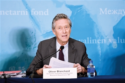 图为当日国际货币基金组织首席经济学家奥利维耶·布朗夏尔介绍《世界经济展望报告》最新预测。(相关报道见四版)