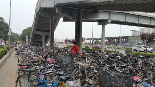 在八通线终点土桥站西北角的公交车站,有近十条从河北香河、廊坊等地开来的通勤公交线路。过街天桥下被数以百计的自行车塞得满满当当,而地铁站下的停车场也鲜有空位。图为7月20日下午4时许,一名市民在寻找自己的自行车