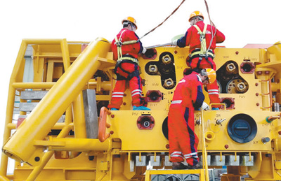 经过多年努力,上海美钻能源科技有限公司自主制造的生产系统核心装备井口采油树及水下连接器等,已在多海域投入使用。图为组装情景。 |