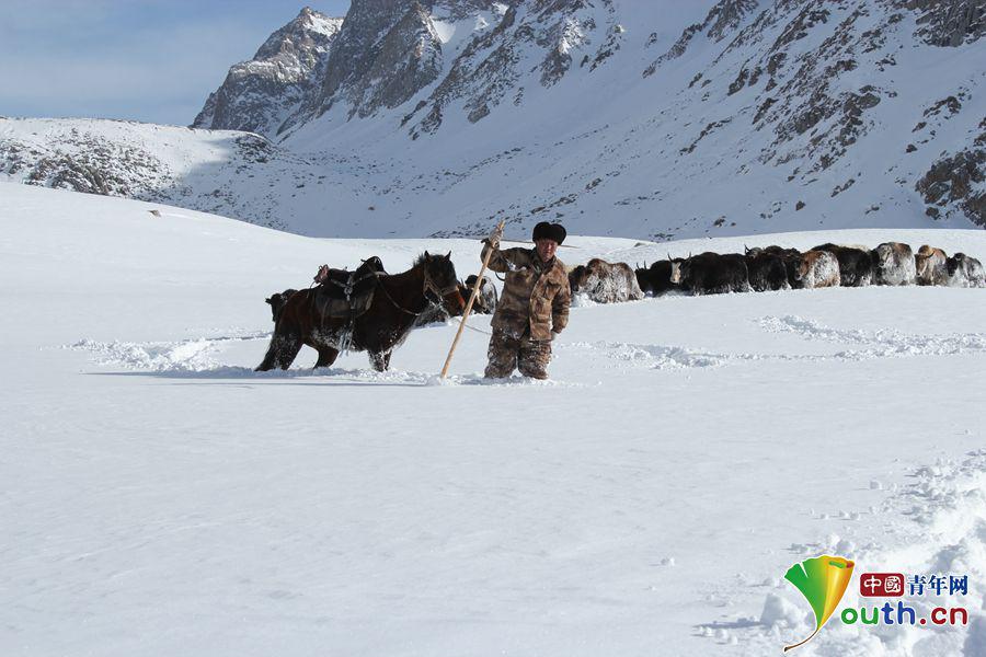 努尔江走在转场牲畜队伍前面,踏雪翻越冰大坂。资料图