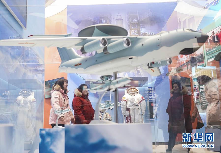 12月31日,参观者在庆祝中华人民共和国成立70周年大型成就展上观看我国自主研制的预警机“空警-2000”模型。新华社记者 殷刚 摄