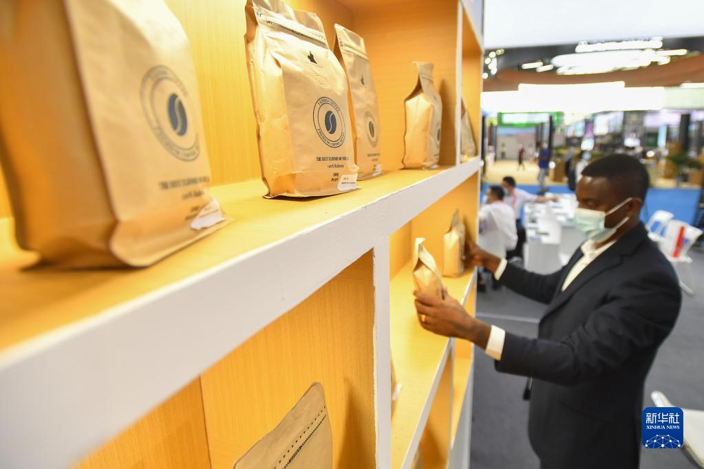 9月27日,在湖南长沙举行的第二届中国-非洲经贸博览会上,参展商在整理非洲咖啡。新华社记者 陈泽国 摄