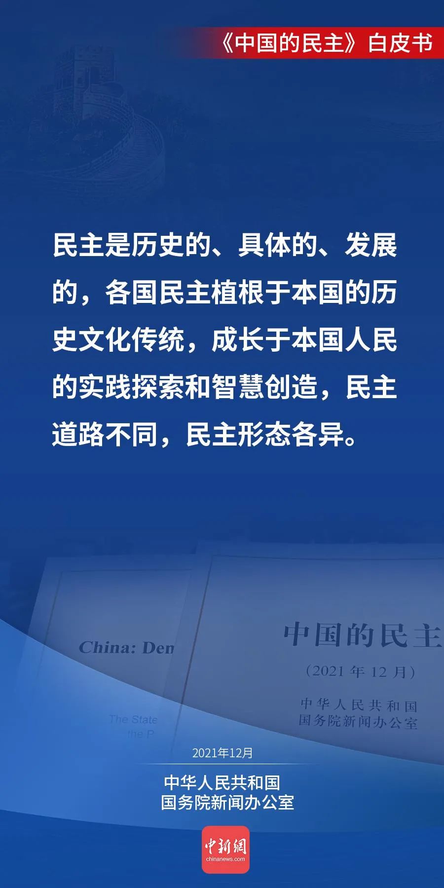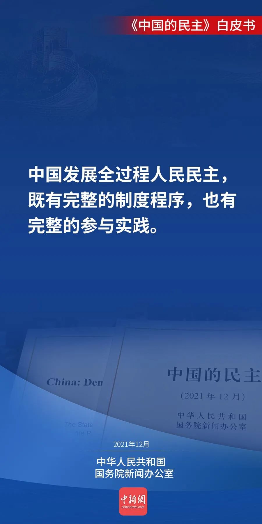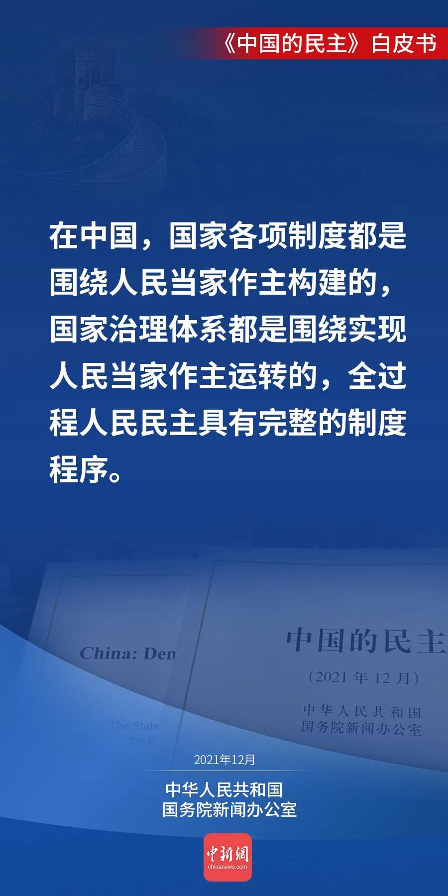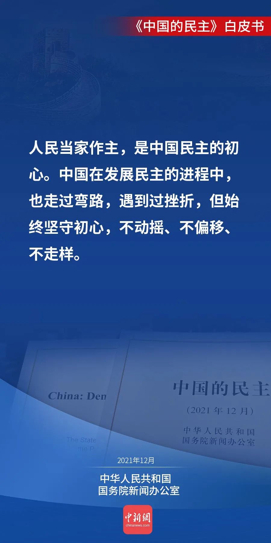 国务院新闻办公室12月4日发表《中国的民主》白皮书。白皮书说,人民当家作主,是中国民主的初心。今天的中国,人民当家作主的内涵不断丰富、渠道不断拓宽、效能不断提升,中国民主不断向前推进。↓↓↓
