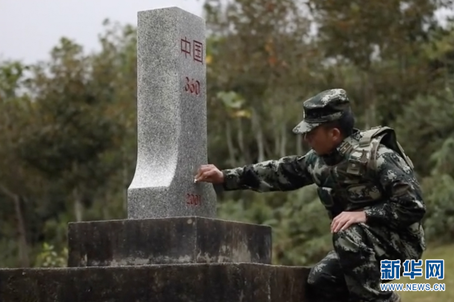 张俊擦拭界碑(资料图)新华网发。(天保出入境边防检查站供图)
