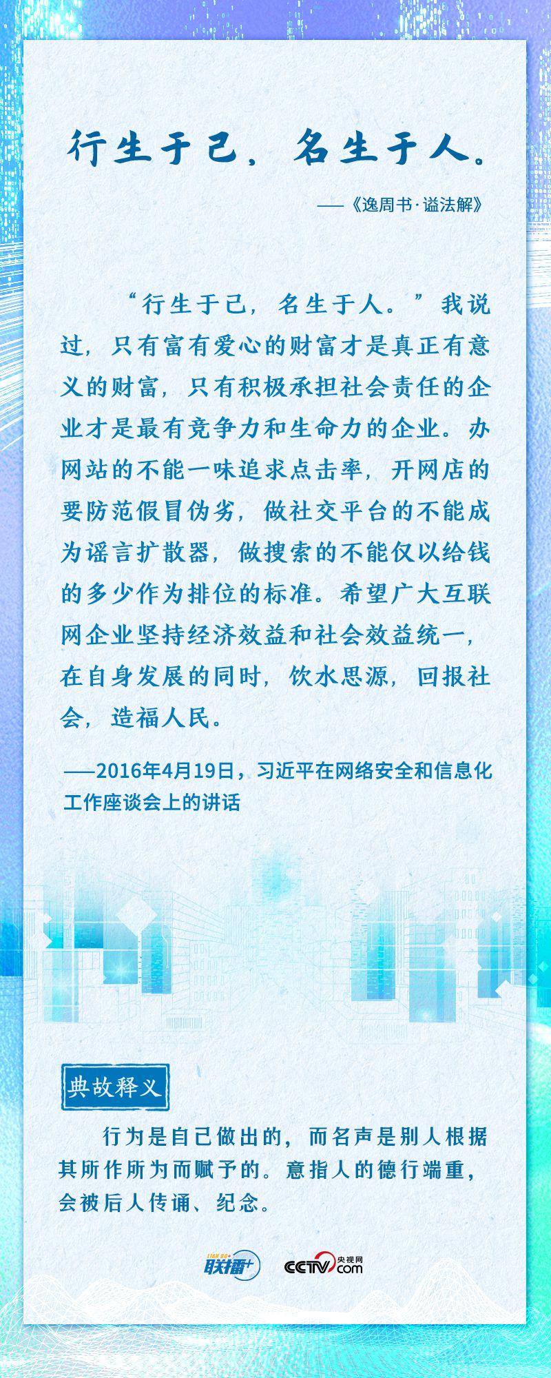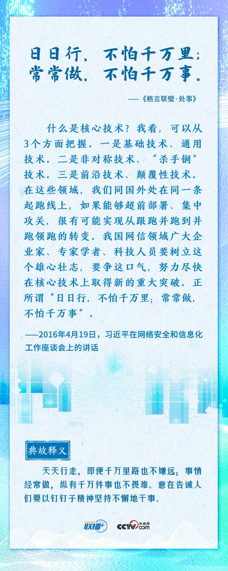 “知屋漏者在宇下,知政失者在草野”“日日行,不怕千万里;常常做,不怕千万事”......2016年4月19日,习近平总书记在网络安全和信息化工作座谈会上,从六个方面深刻回答了事关我国网信事业发展的一系列重大理论和实践问题,并多次引经据典加以阐述。