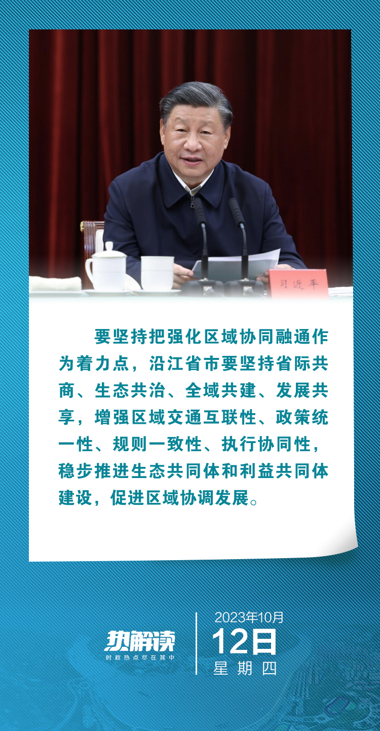 总书记表示,要坚持把强化区域协同融通作为着力点,并要求沿江省市增强区域交通互联性、政策统一性、规则一致性、执行协同性,稳步推进生态共同体和利益共同体建设,促进区域协调发展。