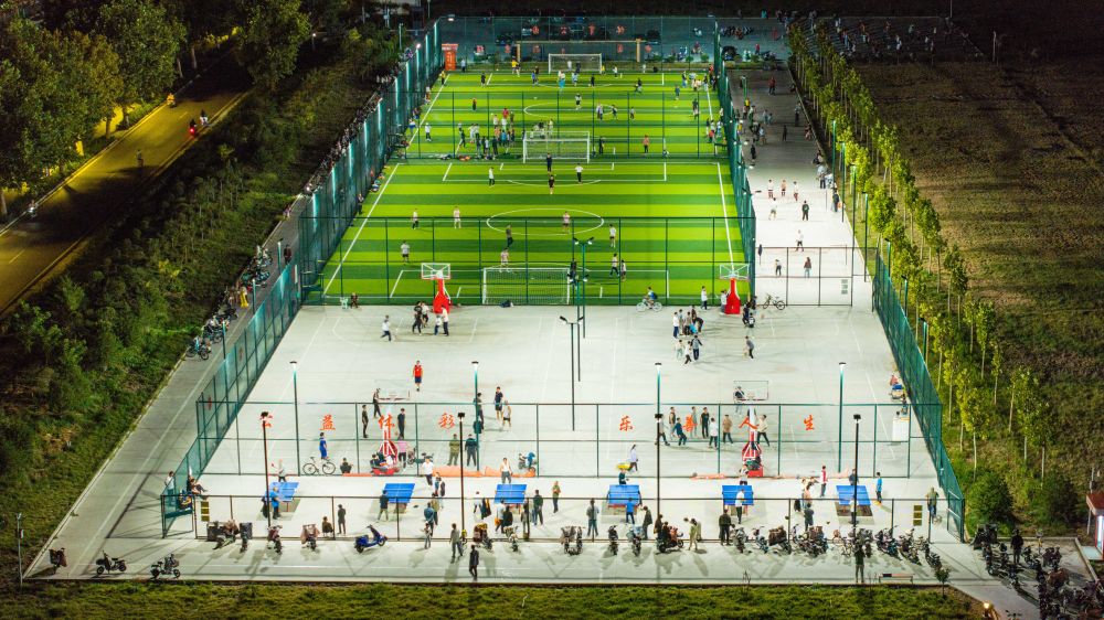 2024年9月21日,居民在山东省宁阳县城区一处体育公园内运动(无人机照片)。近年来,宁阳县充分利用城市空闲区域,新建或改建体育健身公园,为居民打造“10分钟体育健身圈”,让城市的“金角银边”成为全民健身大舞台。