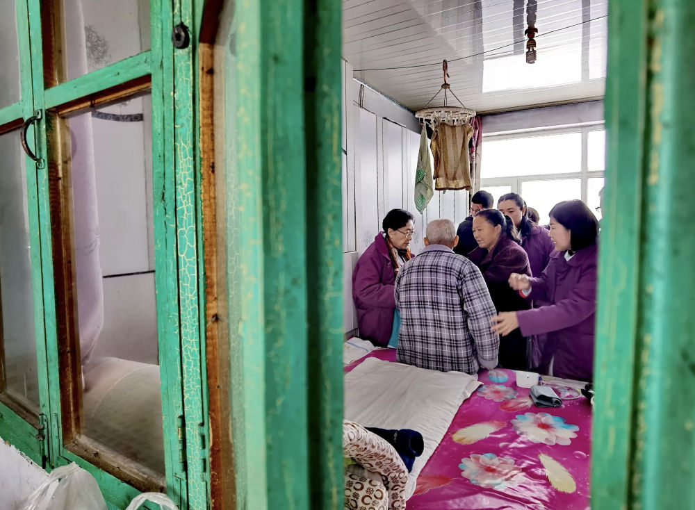 2024年11月26日,87岁的辽宁金秋医院“菊香爱心团队”领队张菊香(左一)冒雪到行动不便的患者家中诊治。多年来,数百名热心公益事业的“菊香爱心团队”医务工作者在辽宁的乡村、街道社区为群众提供优质医疗服务,先后开展大型义诊活动近百次,诊治群众超过6万人次;举办健康科普讲座超过60场,受益群众超过4万人;培训乡村基层医务人员上千人。