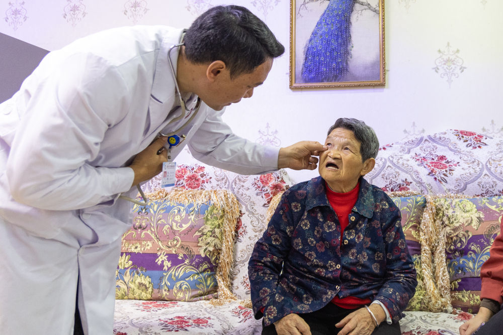 2024年10月10日,一名家庭医生在重庆高新区白市驿镇驿站社区上门为老人做健康检查。近年来,重庆高新区积极探索养老服务创新形式,通过“智慧养老云平台”监测健康数据,为独居、空巢、失能等困难老年人提供生活照料、精神慰藉、文娱教育、健康管理等个性化服务,让辖区老年人享受到优质、便捷的居家养老服务。