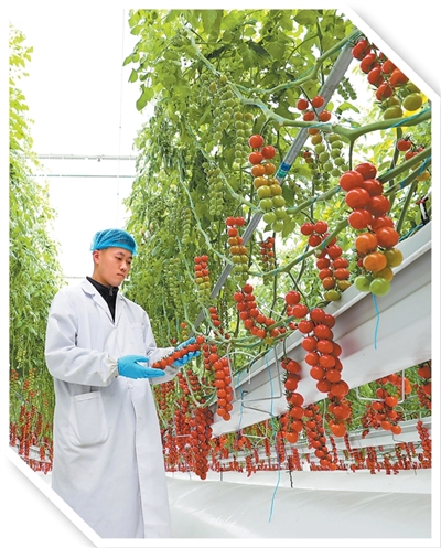 安徽省淮北市烈山区古饶智慧农业产业园,技术人员检查番茄的生长情况。 |