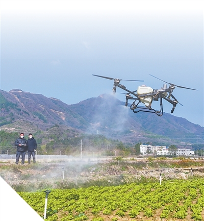 湖南省永州市新田县东升农场蔬菜基地,菜农使用无人机对蔬菜秧苗进行飞防作业。 |