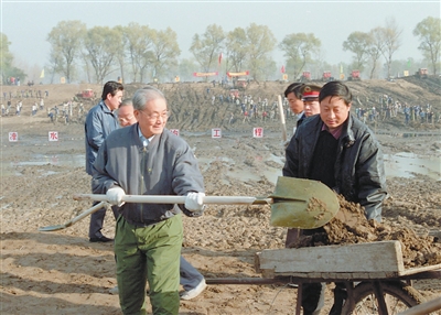 1991年11月13日,宋平同志(左)来到北京市通县(今通州区)张家湾凉水河整治工程工地参加劳动。 |