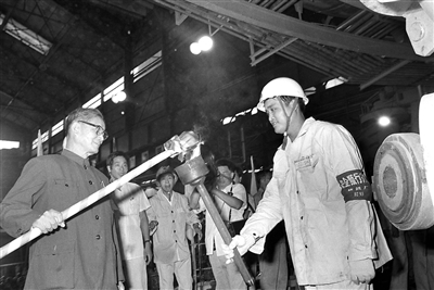 1985年9月15日,我国第一座日产万吨铁的高炉——宝钢一号高炉点火试生产。这是宋平同志(左一)为高炉点火。 |