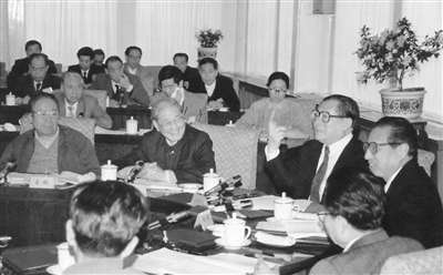 1991年4月,江泽民同志、宋平同志(前排左二)等与参加党建理论讨论会的代表座谈。 |