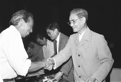 1991年6月26日,中共中央组织部、中共中央宣传部等单位在北京召开大会,表彰全国高校优秀思想政治工作者。这是宋平同志(右)向获奖的个人颁奖。 |