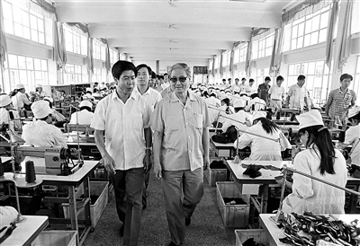 1990年8月14日,宋平同志(右)在山东省威海市文登区考察。 |